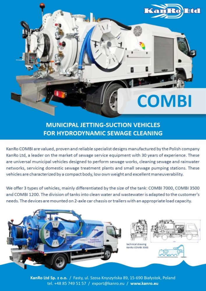 KanRo COMBI 7000 sewer cleaning vehicle is a well-known construction for many years, produced and offered in Poland by KanRo Ltd®. These Jetting/Vacuum Combination units use high-pressure water jetting combined with a high-flow vacuum source to clean out pipes and sewers and then vacuum up the material, which returns and maintains normal sewer flow. Vehicle operation has been designed with focus on simple handling. Characterized by a compact construction, low own weight and excellent maneuverability. Complies with all road traffic regulations, including those regarding the permissible load capacity and total weight and the permissible axle loads.