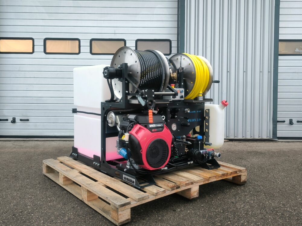 PYTHON 2.0 high-pressure jetting machin can be mounted on standard 1- and 2-axis transport trailers. In addition, trailers can be equipped with a factory frame with a tarpaulin or a plastic housing. It can also be fitted to commercial van vehicles. Everywhere where big cleaning cars cannot be reached, PYTHON will be perfect.