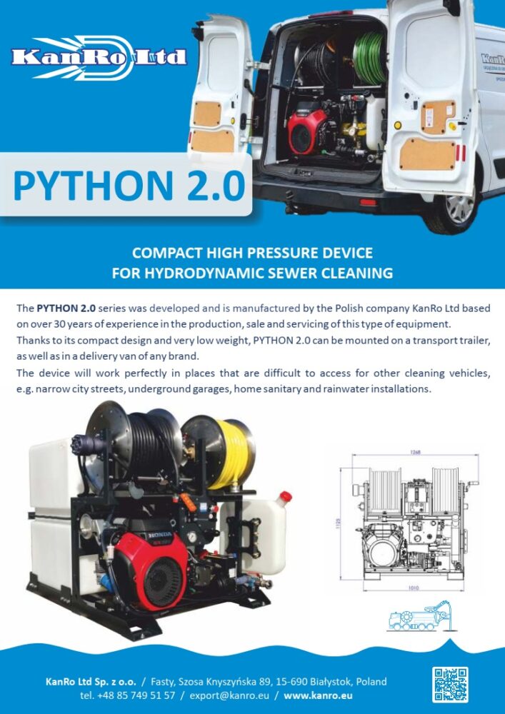 PYTHON 2.0 very functional device with small dimensions, designed for hydrodynamic cleaning of sanitary, rainwater and industrial pipes with a maximum diameter of up to 400 mm (depending on the version). The device has been developed and manufactured by KanRo Ltd® based on many years of experience in the sale and service of high-pressure cleaning equipment.
